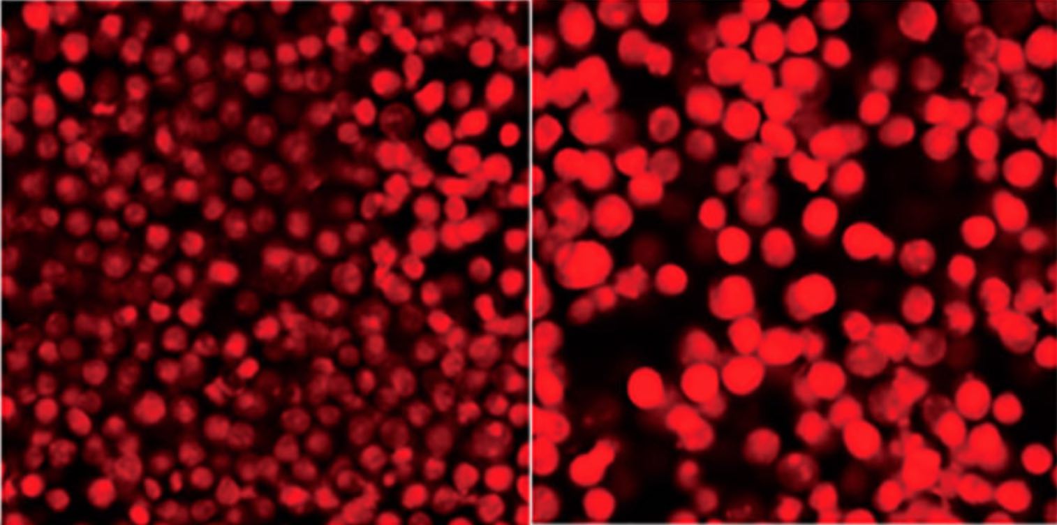 在顯微鏡檢查和高內涵篩選中,DRAQ5™ 無需紫外激發即可輕松進行核復染。 在流式細胞術中,DRAQ5™ 允許對血液/BM 進行表型分析并直接進行細胞 DNA 含量分析,而無需任何 RBC 裂解或固定、透化或 RNase 處理。