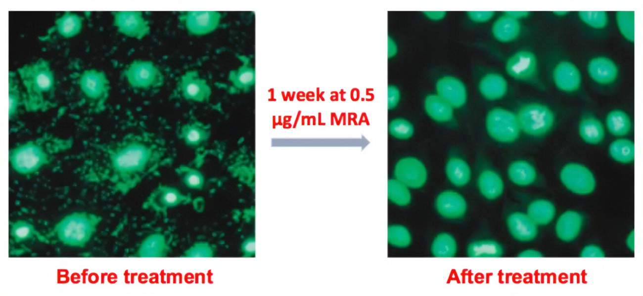 支原體去除劑 (Mycoplasma Removal Agent,MRA)是 BIOFOUNT 提供的一種有效且安全的抗支原體試劑,可用于消除支原體污染或預防性使用以防止污染。支原體去除劑 由三種具有抗支原體特性的抗菌化合物的專利混合物組成。支原體是一種獨特的細菌屬,缺乏細胞壁。它們的小尺寸和無處不在的分布說明了它們在看似無菌的細胞培養中無法被檢測到,但最終會導致細胞特性和過程的改變,從而導致不準確的實驗結論。